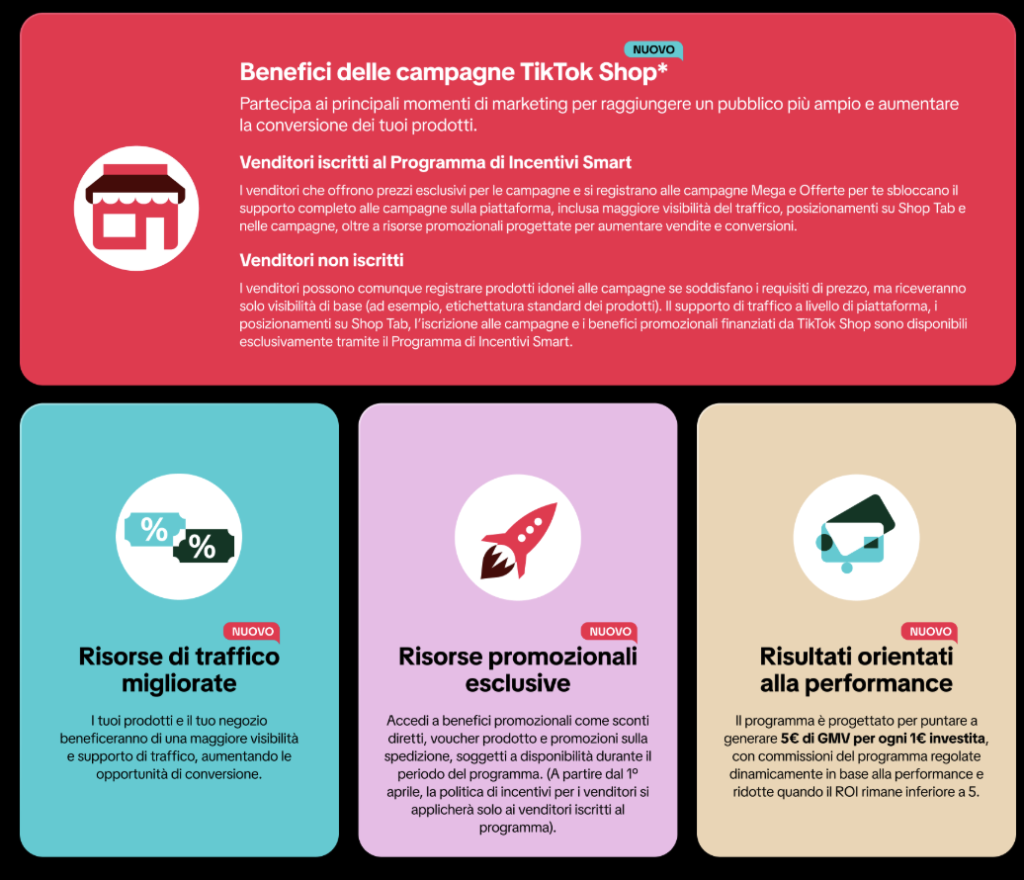 - durante le campagne ufficiali di TikTok Shop può essere applicata una fee aggiuntiva dell’1%, se si sceglie di partecipare