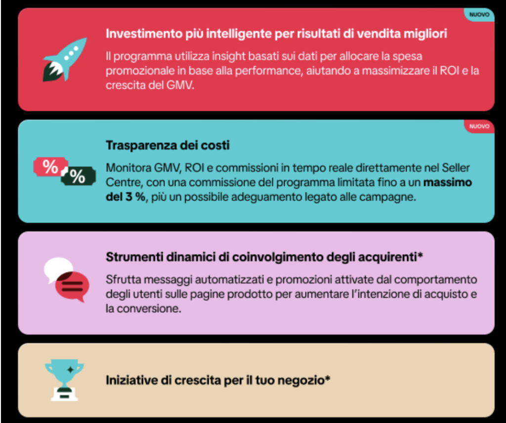- viene applicata una fee variabile tra lo 0,5% e il 3% sul GMV totale del negozio durante il periodo del programma